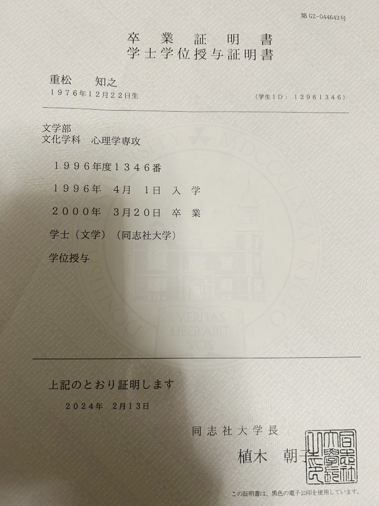 昨今の学歴詐称問題を受け、少し気になることがありました。 それは他でもない、私の卒業大学! 添付の画像にもあるように、確かに同志社大学文学部文化学科心理学専攻を卒業しています(たまたま証明書が手元にあったので、画像UPし… 続きを読む 重松ともゆき、学歴は詐称していません。